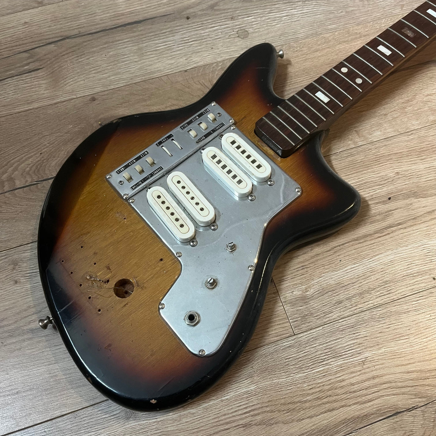 {"id":10455929127077,"title":"Guyatone \/ Teisco Project 4 Pick Up (MIJ) 1960's","handle":"guyatone-project-4-pu","description":"\u003cp\u003ePickups work, wiring dodgy and missing parts. Missing Tailpiece and some ferrules. Cool project though. \u003c\/p\u003e\n\u003cp\u003e\u003cstrong\u003eABOUT THESE PROJECT GUITARS\u003c\/strong\u003e\u003c\/p\u003e\n\u003cp\u003eI've accumulated too many project guitars over the years and need to clear some space. \u003c\/p\u003e\n\u003cp\u003eThese are sold as is as they have not been properly checked over. So please bear that in mind when looking. They have been priced accordingly. \u003c\/p\u003e\n\u003cp\u003eMost of them will need re-wiring and a fair bit of love. But there are some cool guitars amongst this lot for the creative mind to bring back to life. \u003c\/p\u003e\n\u003cp\u003eShipping rate is a flat $35 Australia Wide. They will be shipped with the necks off to bring the shipping price down. \u003c\/p\u003e","published_at":"2026-01-21T14:50:17+11:00","created_at":"2026-01-21T13:08:08+11:00","vendor":"Southside Sounds","type":"Project Guitars","tags":["Project Guitars","Type_Used","Vintage MIJ"],"price":5500,"price_min":5500,"price_max":5500,"available":true,"price_varies":false,"compare_at_price":null,"compare_at_price_min":0,"compare_at_price_max":0,"compare_at_price_varies":false,"variants":[{"id":47415135010981,"title":"Default Title","option1":"Default Title","option2":null,"option3":null,"sku":null,"requires_shipping":true,"taxable":true,"featured_image":null,"available":true,"name":"Guyatone \/ Teisco Project 4 Pick Up (MIJ) 1960's","public_title":null,"options":["Default Title"],"price":5500,"weight":3500,"compare_at_price":null,"inventory_management":"shopify","barcode":null,"requires_selling_plan":false,"selling_plan_allocations":[]}],"images":["\/\/southsidesounds.com.au\/cdn\/shop\/files\/IMG-3485.jpg?v=1768967078","\/\/southsidesounds.com.au\/cdn\/shop\/files\/IMG-3486.jpg?v=1768967103","\/\/southsidesounds.com.au\/cdn\/shop\/files\/IMG-3487.jpg?v=1768961348","\/\/southsidesounds.com.au\/cdn\/shop\/files\/IMG-3488.jpg?v=1768961348","\/\/southsidesounds.com.au\/cdn\/shop\/files\/IMG-3489.jpg?v=1768961348","\/\/southsidesounds.com.au\/cdn\/shop\/files\/IMG-3490.jpg?v=1768961348","\/\/southsidesounds.com.au\/cdn\/shop\/files\/IMG-3491.jpg?v=1768967142","\/\/southsidesounds.com.au\/cdn\/shop\/files\/IMG-3492.jpg?v=1768967171"],"featured_image":"\/\/southsidesounds.com.au\/cdn\/shop\/files\/IMG-3485.jpg?v=1768967078","options":["Title"],"media":[{"alt":null,"id":36468303495333,"position":1,"preview_image":{"aspect_ratio":1.0,"height":3024,"width":3024,"src":"\/\/southsidesounds.com.au\/cdn\/shop\/files\/IMG-3485.jpg?v=1768967078"},"aspect_ratio":1.0,"height":3024,"media_type":"image","src":"\/\/southsidesounds.com.au\/cdn\/shop\/files\/IMG-3485.jpg?v=1768967078","width":3024},{"alt":null,"id":36468303528101,"position":2,"preview_image":{"aspect_ratio":1.0,"height":3024,"width":3024,"src":"\/\/southsidesounds.com.au\/cdn\/shop\/files\/IMG-3486.jpg?v=1768967103"},"aspect_ratio":1.0,"height":3024,"media_type":"image","src":"\/\/southsidesounds.com.au\/cdn\/shop\/files\/IMG-3486.jpg?v=1768967103","width":3024},{"alt":null,"id":36468303560869,"position":3,"preview_image":{"aspect_ratio":1.0,"height":3024,"width":3024,"src":"\/\/southsidesounds.com.au\/cdn\/shop\/files\/IMG-3487.jpg?v=1768961348"},"aspect_ratio":1.0,"height":3024,"media_type":"image","src":"\/\/southsidesounds.com.au\/cdn\/shop\/files\/IMG-3487.jpg?v=1768961348","width":3024},{"alt":null,"id":36468303593637,"position":4,"preview_image":{"aspect_ratio":1.0,"height":3024,"width":3024,"src":"\/\/southsidesounds.com.au\/cdn\/shop\/files\/IMG-3488.jpg?v=1768961348"},"aspect_ratio":1.0,"height":3024,"media_type":"image","src":"\/\/southsidesounds.com.au\/cdn\/shop\/files\/IMG-3488.jpg?v=1768961348","width":3024},{"alt":null,"id":36468303626405,"position":5,"preview_image":{"aspect_ratio":1.0,"height":3024,"width":3024,"src":"\/\/southsidesounds.com.au\/cdn\/shop\/files\/IMG-3489.jpg?v=1768961348"},"aspect_ratio":1.0,"height":3024,"media_type":"image","src":"\/\/southsidesounds.com.au\/cdn\/shop\/files\/IMG-3489.jpg?v=1768961348","width":3024},{"alt":null,"id":36468303659173,"position":6,"preview_image":{"aspect_ratio":1.0,"height":3024,"width":3024,"src":"\/\/southsidesounds.com.au\/cdn\/shop\/files\/IMG-3490.jpg?v=1768961348"},"aspect_ratio":1.0,"height":3024,"media_type":"image","src":"\/\/southsidesounds.com.au\/cdn\/shop\/files\/IMG-3490.jpg?v=1768961348","width":3024},{"alt":null,"id":36468303691941,"position":7,"preview_image":{"aspect_ratio":1.0,"height":2835,"width":2835,"src":"\/\/southsidesounds.com.au\/cdn\/shop\/files\/IMG-3491.jpg?v=1768967142"},"aspect_ratio":1.0,"height":2835,"media_type":"image","src":"\/\/southsidesounds.com.au\/cdn\/shop\/files\/IMG-3491.jpg?v=1768967142","width":2835},{"alt":null,"id":36468303724709,"position":8,"preview_image":{"aspect_ratio":1.0,"height":2646,"width":2646,"src":"\/\/southsidesounds.com.au\/cdn\/shop\/files\/IMG-3492.jpg?v=1768967171"},"aspect_ratio":1.0,"height":2646,"media_type":"image","src":"\/\/southsidesounds.com.au\/cdn\/shop\/files\/IMG-3492.jpg?v=1768967171","width":2646}],"requires_selling_plan":false,"selling_plan_groups":[],"content":"\u003cp\u003ePickups work, wiring dodgy and missing parts. Missing Tailpiece and some ferrules. Cool project though. \u003c\/p\u003e\n\u003cp\u003e\u003cstrong\u003eABOUT THESE PROJECT GUITARS\u003c\/strong\u003e\u003c\/p\u003e\n\u003cp\u003eI've accumulated too many project guitars over the years and need to clear some space. \u003c\/p\u003e\n\u003cp\u003eThese are sold as is as they have not been properly checked over. So please bear that in mind when looking. They have been priced accordingly. \u003c\/p\u003e\n\u003cp\u003eMost of them will need re-wiring and a fair bit of love. But there are some cool guitars amongst this lot for the creative mind to bring back to life. \u