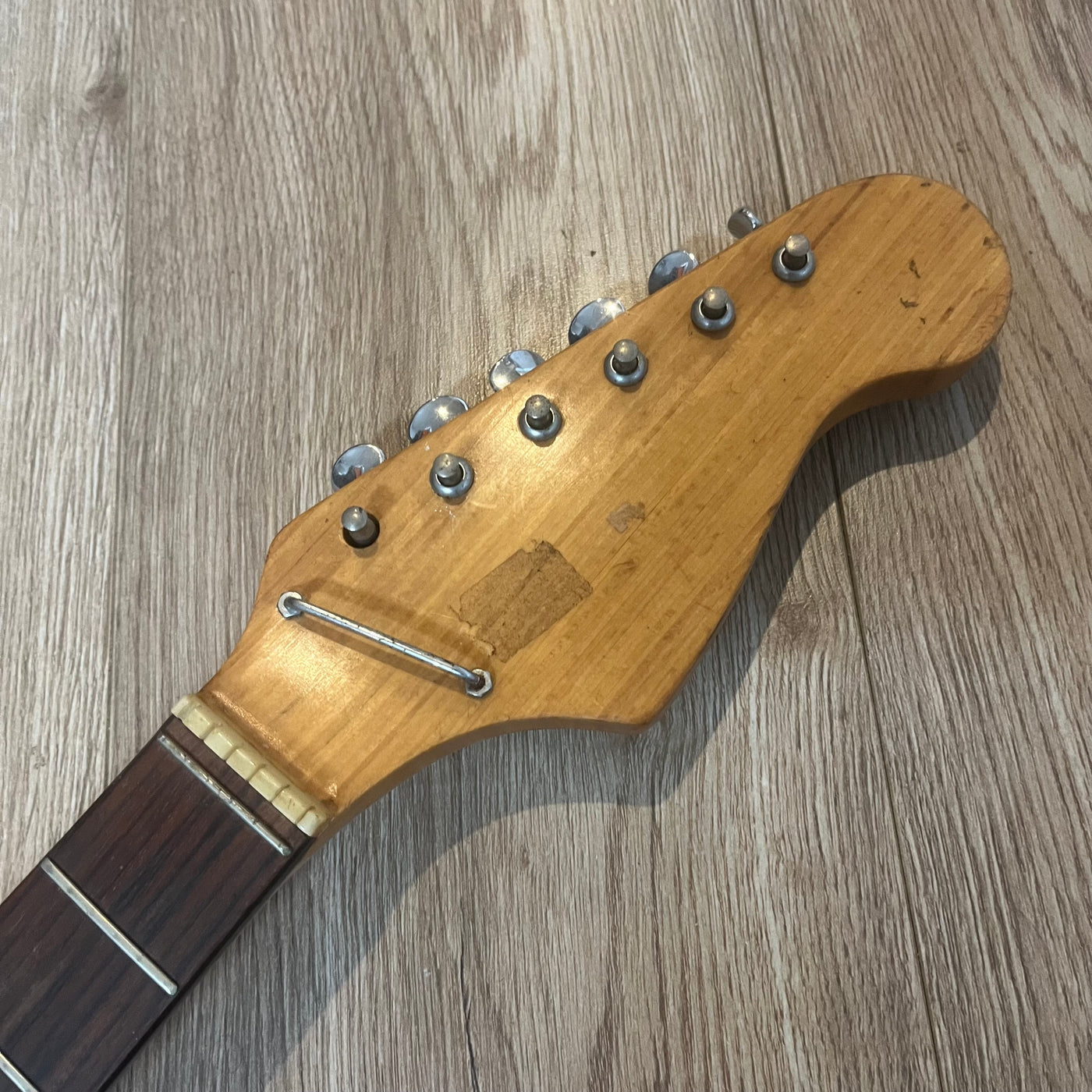 This one has heaps of potential. Pickups and wiring work, just needs a bridge and maybe some tuner upgrades. It's worth it just for the pickups alone.